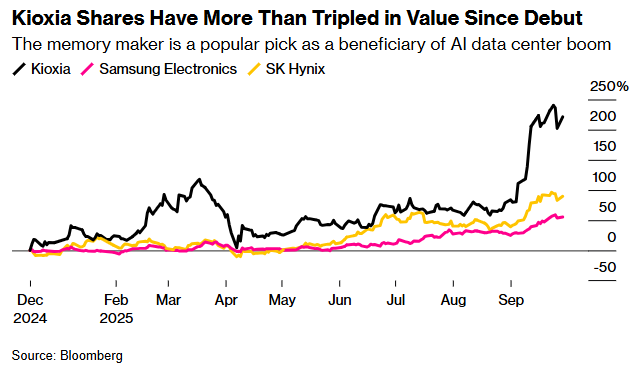 渡边指出,当前需求强劲主要来自超大规模AI芯片需求方,部分客户正计划更换五六年前部署的服务器,另有客户反馈硬盘供应短缺。自2024年12月在东京上市以来,Kioxia股价已翻三倍,市值与韩国内存巨头三星电子、SK海力士并驾齐驱,成为AI基础设施热潮的受益者。