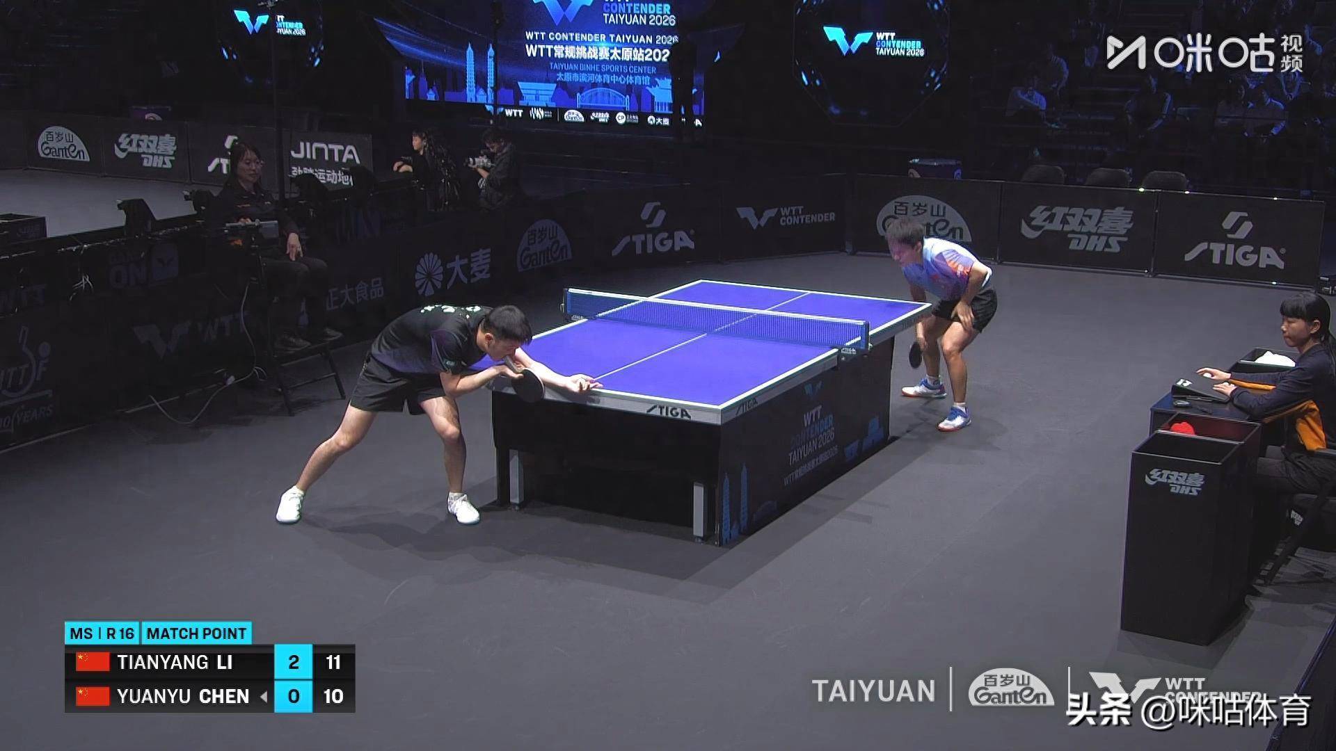 2026WTT常规挑战赛太原站男单 1/8 决赛中,李天阳发挥稳定,以11-7、11-9、12-10直落三局击败陈垣宇,成功晋级男单 8 强。